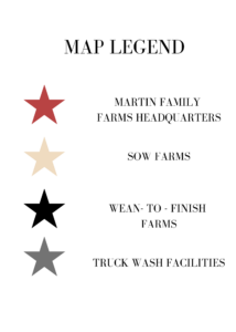 The Martin Family Farms production system (mapped out below) consists of 14,000 sows located in two separate sites, each with 4,000 and 10,000 sows.